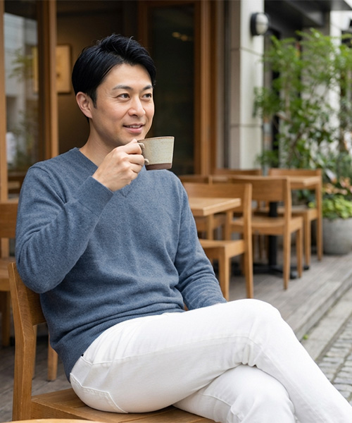 タカシマヤの「洗えるカシミヤ(ウォシュミヤ)」。ジップの開け具合で印象が変わり、インナー使いもできる使い勝手に優れたハーフジップセーターです。