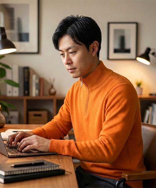 2025年新デザインのニットシャツ。裾、袖を細リブ仕様にすることで、タックイン・タックアウトどちらでもコーディネートしやすい形に仕上げました。