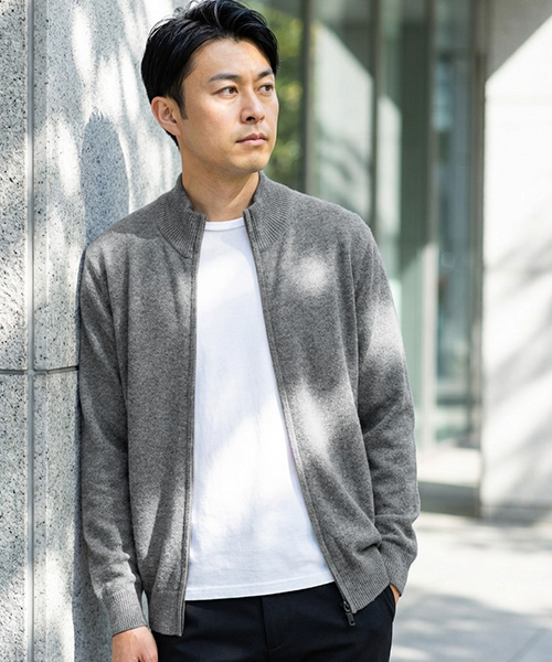 2024年度ヒット商品のフルジップセーター。フルジップタイプで着回しもしやすく、ボリュームが出すぎず、インナー使いもできる使い勝手に優れたアイテムです。