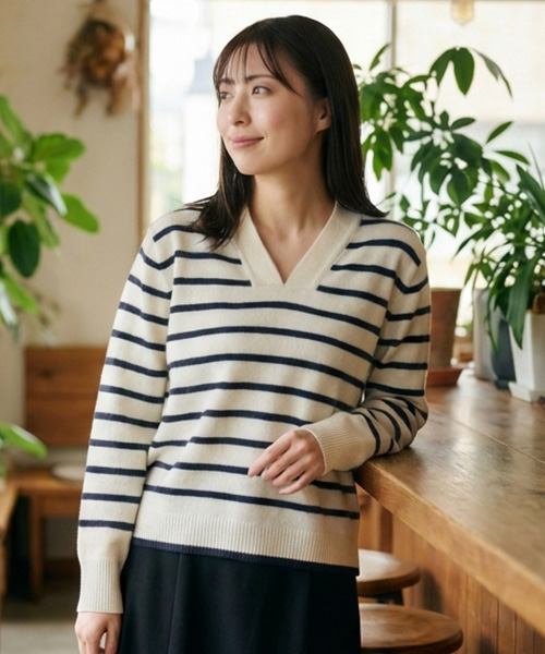 カシミヤ ボーダーVネックセーター