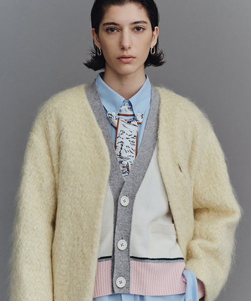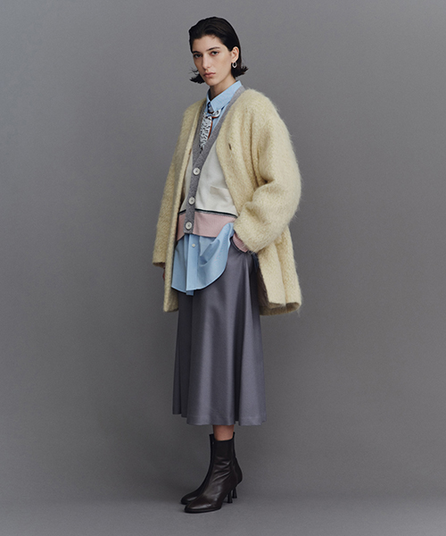 ふわっとした膨らみと柔らかな風合いが魅力のミドルコート。モヘヤ・アルパカ・ベース糸の微配色がほど良いミックス感を演出。