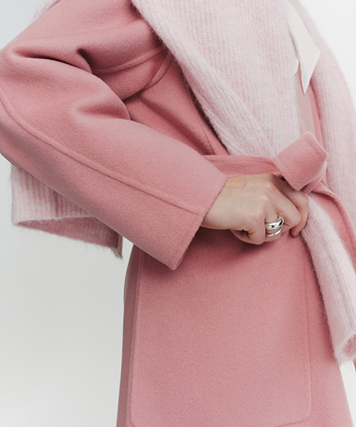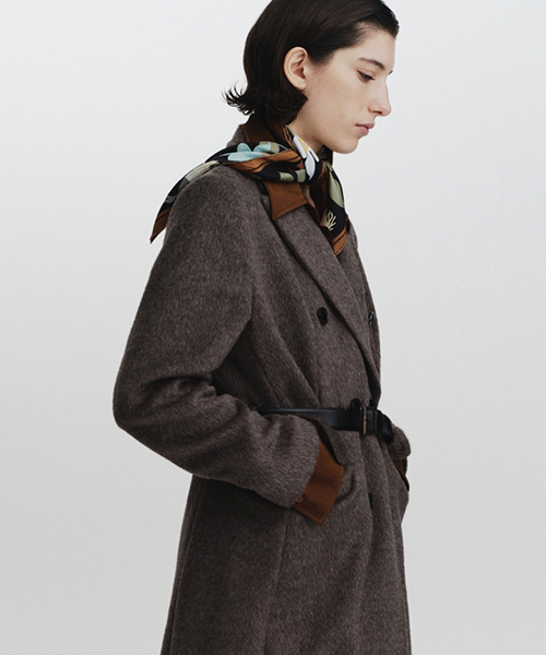 ナチュラルな光沢感のあるスーリーアルパカ素材を使用。付属のレザーベルトを使ってウエストマークすれば、より女性らしいバランスでお召しいただけます。