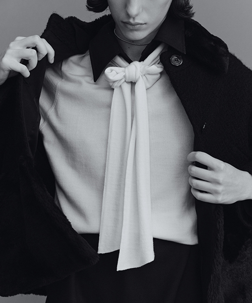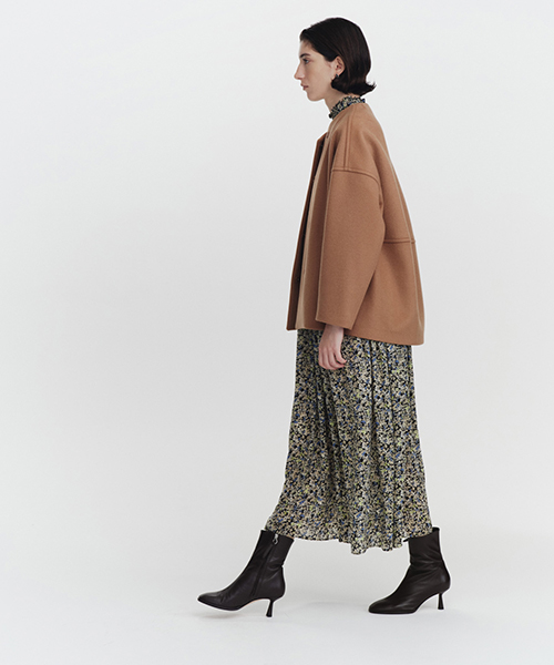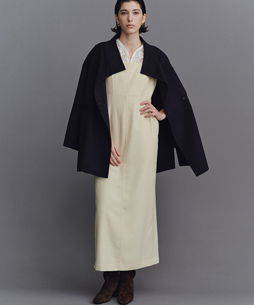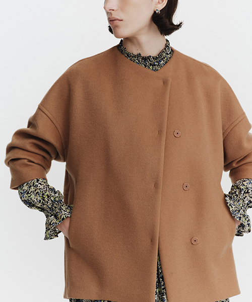 上品で柔らかな風合いとナチュラルなツヤ感が魅力。大胆なドロップショルダーに丸みのあるシルエットでコンパクトに着用できる一着。