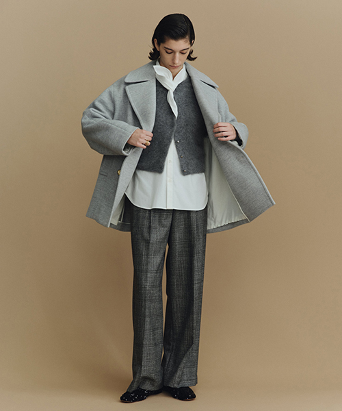 上品な光沢感のあるウールのダブルフェイス素材を使用したコート。リバー仕立てならではの柔らかさと軽やかな着心地が魅力。