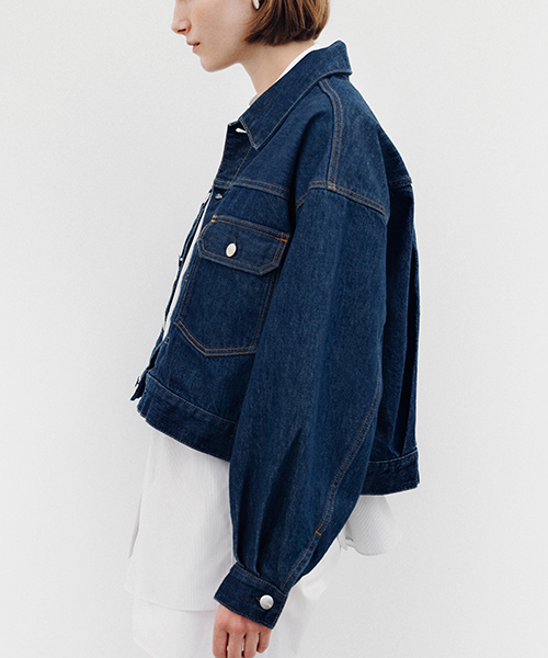 オーバーシルエットのデニムジャケットをベースに仕立てた別注の一着。 タックを多く施すことで着用時に美しい立体感が生まれ、さりげない遊び心を感じさせます。 フロントのシングルポケットとボリュームを持たせたパフスリーブがフェミニンな表情を引き立てます。