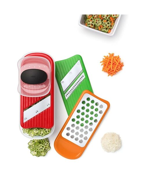 スライサー、大根おろし、千切りの3種類のブレードが付いたコンパクトサイズのセットです。薬味にカットにも。ケースの蓋は受け皿として使えます。滑り止め付きで使用中もしっかりと安定。