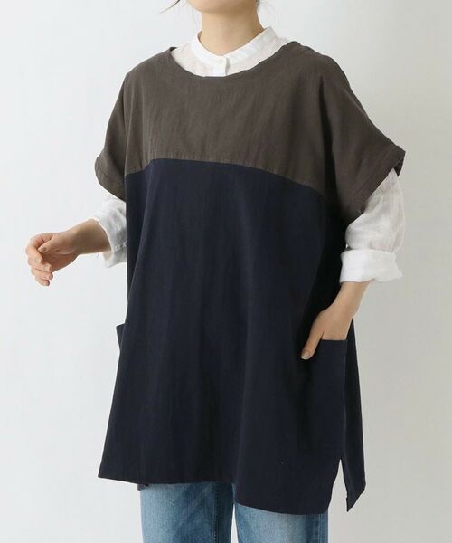 コットン100%の生地に洗い加工を施し、胸元で色を切り替えてアクセントをつけています。
