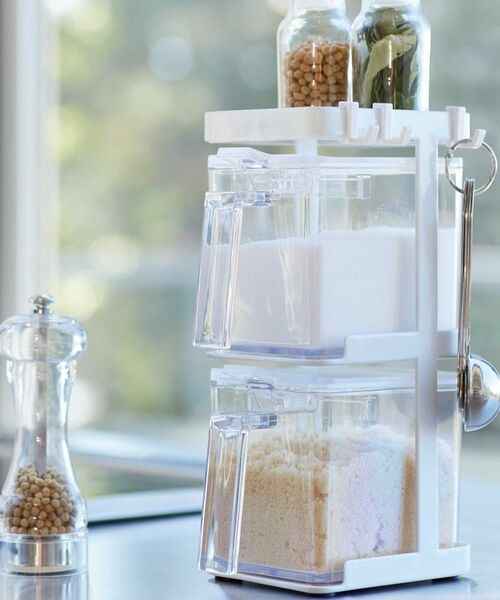 縦に積んで省スペースに調味料ストッカーを収納 !調理スペースを広々取れて快適にキッチン仕事ができる調味料ラックと、調味料ストッカーLが2個のセット。調味料ストッカー:約650ml