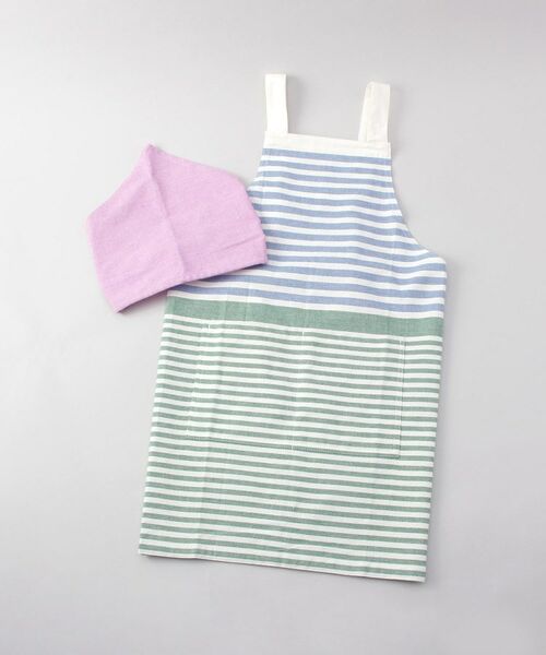 爽やかなボーダー柄が特徴的で、カジュアルさとかわいらしさを兼ね備えたキッズ向けのエプロンです。