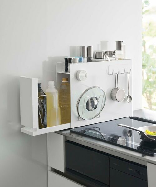コンロの横に調味料を隠して収納!油跳ねで調味料が汚れるのを防ぎます。引き出し式で、油のボトル類も収納できる大容量の調味料ラック。小さいスパイス類や調味料ストッカーは上段に収納可能。ガードが付いているので見た目もスッキリ。光沢のある本体で、お手入れもラクラク。マグネットが付くので、タワーシリーズのマグネット商品(別売)を貼り付けて便利にカスタマイズ!