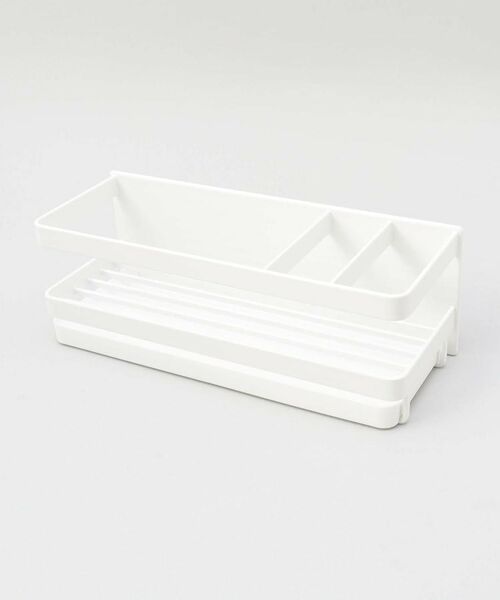 洗い物後の気になる水滴を防ぐトレー付きのスポンジ&ディスペンサーラック。スポンジを2つ立てて収納できます。トレーは引き出して手軽に洗うことができます。小物を収納することができるフック付き。マグネット式で高さを自由に変えることができるので長物も収納することができます。スポンジ収納に仕切りがあり、隙間を開けて収納できるので衛生的。
