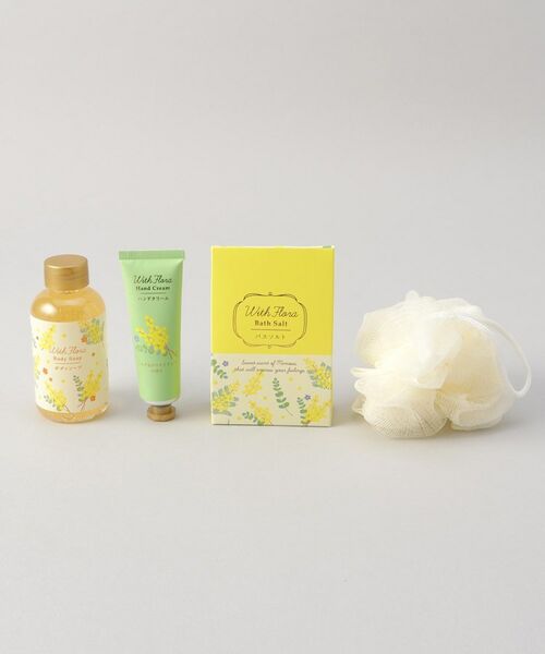 うるおい成分ミモザアカシア花エキス配合のハンドクリーム、バスソルト、ボディソープとスポンジを詰め合わせたボディケアセットです。