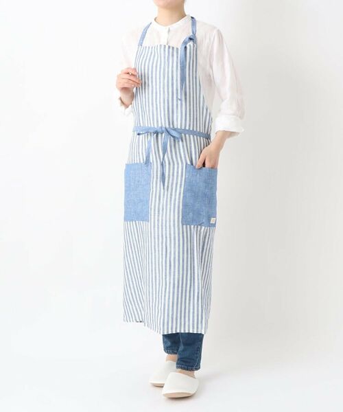 ストライプ生地にポケットのカラーがワンポイントのエプロンはシンプルで男女と問わずお使い頂けます。