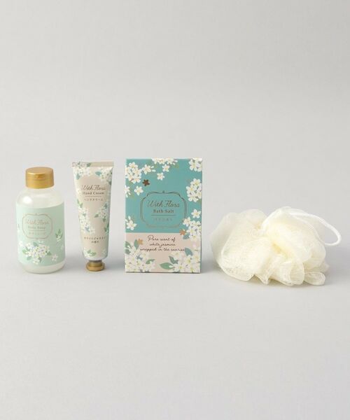 うるおい成分ジャスミン油配合のバスソルトとボディソープ、シアバターとハチミツエキス配合のハンドクリーム、スポンジを詰め合わせたボディケアセットです。