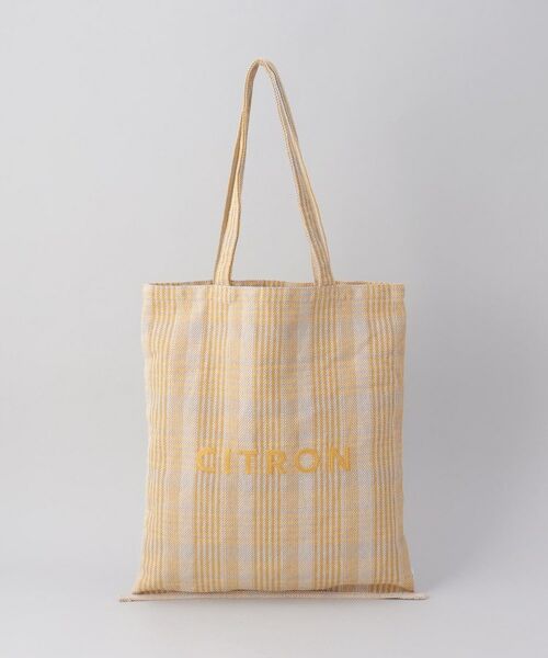 チェックジャガード素材のトートバッグで、フランス語の刺繍がおしゃれなデザインです。