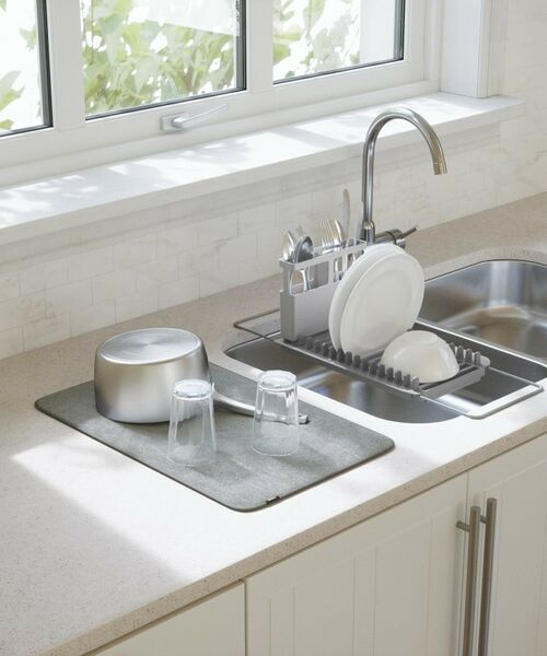 ユードライ オーバー ザ シンク ディッシュラック&ドライ マットは、速乾性のマイクロファイバーマットを備えており、シンクキャディとディッシュ ラックのに取り外し可能です。用途の広い収納と十分なスペースを提供し、食器や調理器具をすばやく乾かすことができます。最大で16枚の皿を置けるディッシュラックとワイヤー アームは33~56cmまでのシンクにフィットします。使用しないときは折りたたんで引き出しや食器棚にコンパクトに収納できるので、すっきりと収納できまます。ドライングマットは洗濯機で丸洗いできるので清潔に使い続けることができます。