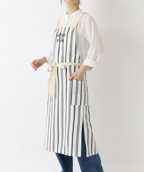 しわになりにくいかっちりした織りのストライプ生地をつかった、ユニセックスなイメージのエプロンです。