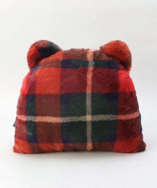 チェックファーの人気の秘密はなめらかな素材。なめらか触感を抱きかかえて味わうクマのシルエットクッションです。