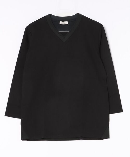【素材】コットン×ポリウレタンのジャージー素材を使用。強撚のコットン糸を使用し、さらっとした肌離れの良さが特徴。【デザイン】同色のレイヤードデザインが特徴のVネック七分袖Tシャツ。一枚メインとしてはもちろん、インナーとしてもおすすめです。