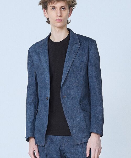 シャープなカッティングでエッジの効いたピークドラペルでブランドらしいデザインになっています。デザインアクセントのハトメ穴釦と本開き仕様で完成度の高いデニムジャケットに。