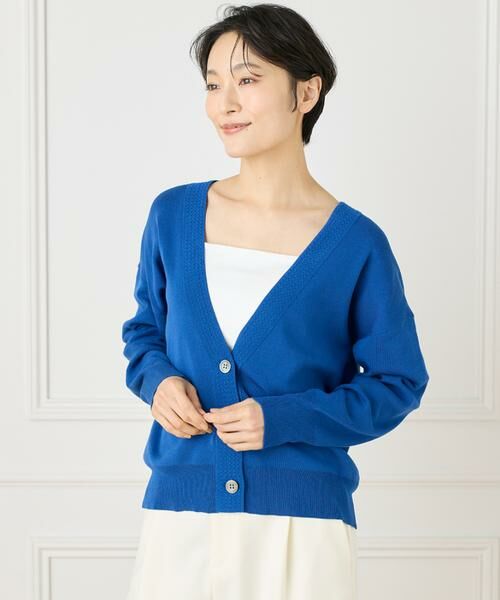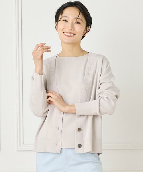衿と前立てにあしらわれた柄がノーブルな印象のVカーディガン。シンプルなカーディガンは一枚持っていると便利ですが、ちょっと差がつくように柄をアクセントにしています。ゆったりとしたサイズ感と程よい肉感は季節の端境期はもちろんのこと、3シーズンたっぷり活躍してくれるとても頼りになる一着です。同素材で展開しているノースリーブニットと着ればアンサンブルとしても活躍します。