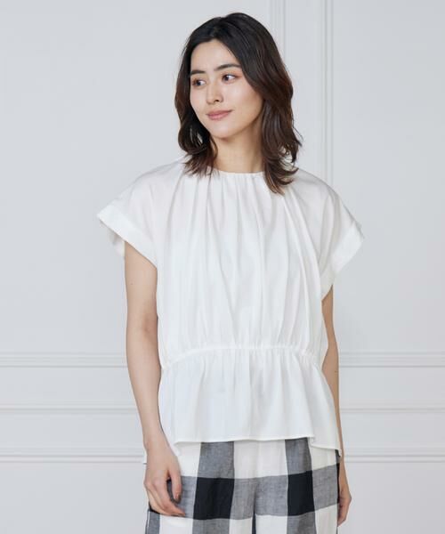 ・シャーリングデザインが映える1枚で華やかなアイテム・ウエストシャーリングはボディーラインを拾わないサイジングでスタイルアップ・二の腕が隠れる丈のフレンチスリーブ・後衿はボタンあき仕様・前後差のあるヘムラインで抜け感あるスタイリングを叶えます・水洗い可■サンプル撮影商品■こちらの商品はサンプルでの撮影となっております。実際の商品とは、サイズや色味、素材、デザイン等の仕様が若干変更になる場合がございます。