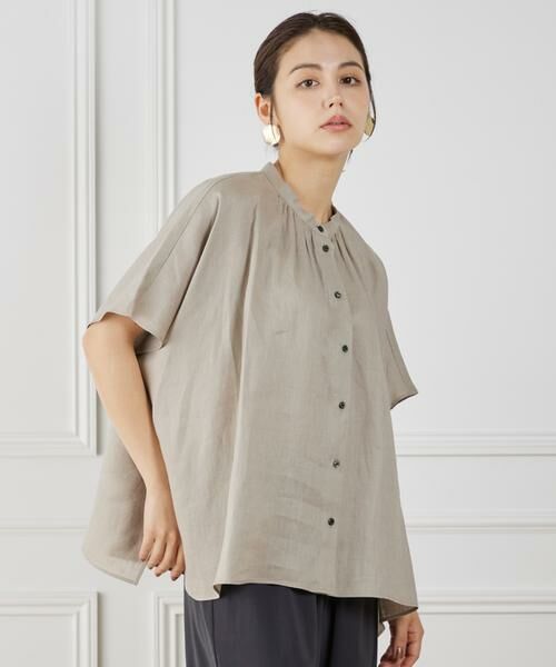 ポンチョ風のシルエットが特徴のバンドカラーブラウス。身体を締め付けないフレア感は風が通り抜ける涼しい着心地を叶えます。襟元のギャザーで表情をプラスすることで顔周りを華やかに演出します。気になる二の腕周りをカバーする袖丈にも拘りました。分量感とスリットディテールで動くたびに揺れる美しいヘムラインもポイントです。