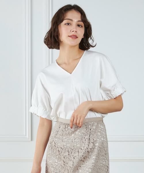 首回りをスッキリとみせるVネックにギャザーで施したふんわりとしたお袖がポイントの半袖Tシャツ。二の腕をカバーできるお袖丈で後衿はファスナーあき仕様。デイリーに着やすく華やかな印象のアイテムです。・後ろファスナー開き・水洗い可■サンプル撮影商品■こちらの商品はサンプルでの撮影となっております。実際の商品とは、サイズや色味、素材、デザイン等の仕様が若干変更になる場合がございます。