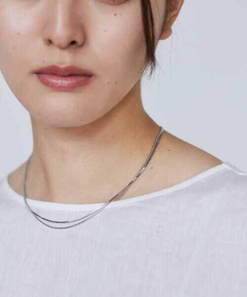 スネークチェーンのショート2連ネックレスは、クールな印象のシルバーでご提案。華奢なチェーンを使用することで、しなやかなカーブラインに。デコルテの開くシャツやVネックなどとのスタイリングがおすすめ。