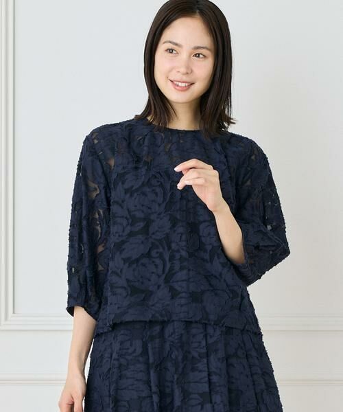 シアー感のある表情豊かなカットジャカード素材を使用したブラウス。ドレッシーな見た目ながらも抜け感のあるボクシーシルエットでストレスフリーな着心地に仕上げました。シンプルなボディにふんわりとしたスリーブやネックラインのタックディテールで表情をプラスしました。同素材のスカートとのセットアップスタイルはワンピ見えも叶うのでちょっとしたお出かけシーンやきちんとした場面にもおすすめです。