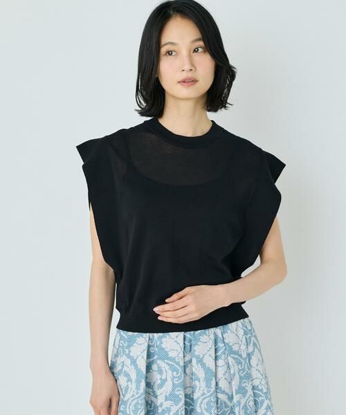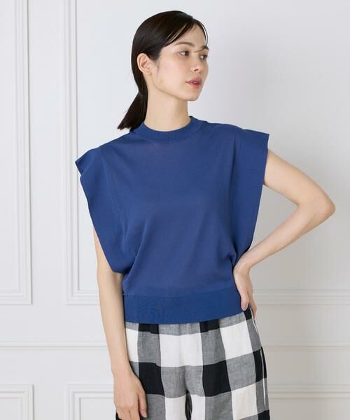 やや透け感と清涼感のある度目、衿ぐりは綺麗目な印象のリブ仕様のプルオーバー。袖口は総針ですっきりとした印象、二の腕が隠れる袖丈で、同素材のカーディガンとのセットコーデもおすすめ