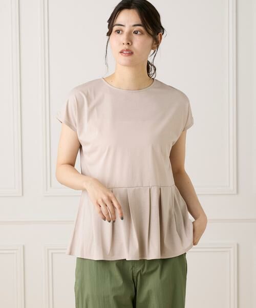 ジャケットやカーディガンのインナーとしても使いやすい、程よくコンパクトなシルエットが魅力のトップス。二の腕が隠れる安心感のある袖丈で、さりげなく体型カバーも叶えます。裾には切り替えとタックを施し、動きのあるヘムラインが女性らしい印象に。一枚で着ても様になる、着回し力抜群のアイテムです。