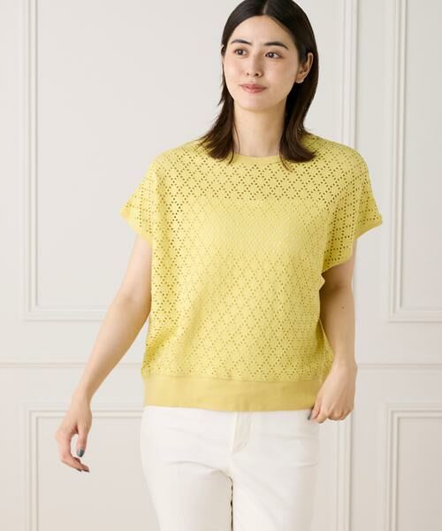 レースのような柄がポイントのアイレットカットワークデザインのプルオーバー。二の腕が隠れる、ほど良い袖丈で、後に向かって長くした抜け感のあるヘムライン。シンプルシルエットなので着回し抜群!1枚着るだけで、大人のカジュアルスタイルが完成。コーディネートの主役になるアイテムです。