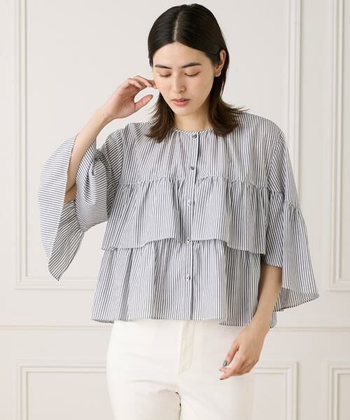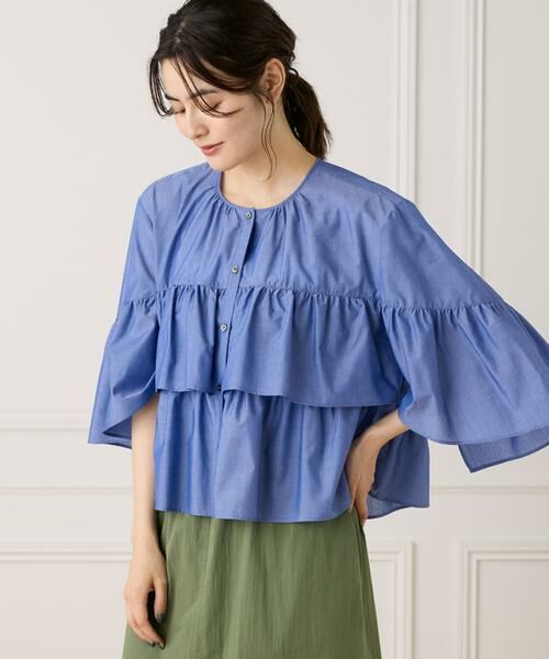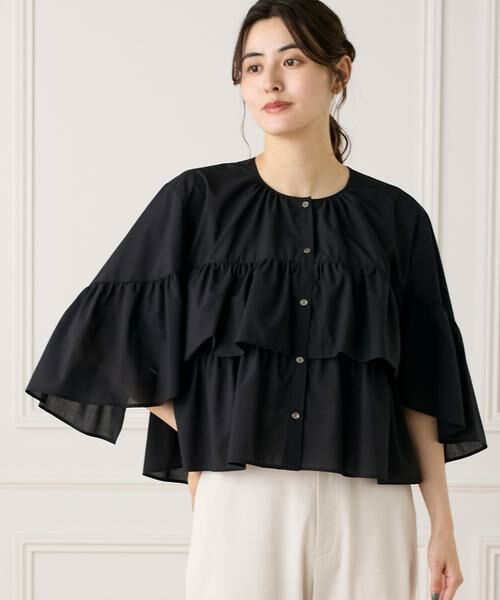存在感のあるティアードフリルが魅力の主役ブラウス。程よいクロップド丈と前後差のあるヘムラインがニュアンスを添え、気になるヒップラインも自然にカバー。肘下までの袖丈で二の腕もさりげなくカバーしつつ、風通しの良い素材で快適な着心地を実現。釦を開けて羽織としても使える2WAY仕様で、夏のスタイリングにひとさじの個性をプラスします。
