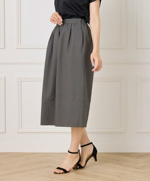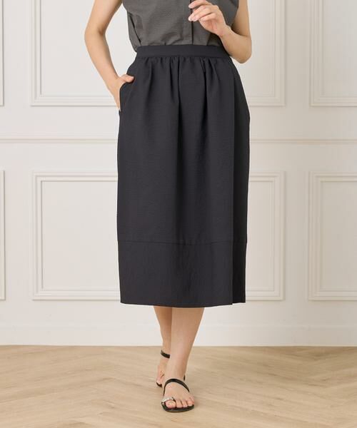 表情のあるサッカー素材を使用した、軽やかで涼しげな印象のスカート。裾に切り替えを施すことで、シルエットにさりげないアクセントをプラスしました。ランダムに入ったタックとギャザーが動きにニュアンスを加えつつ、広がりすぎないすっきりとしたストレートラインで大人らしい印象に。後ろウエストはゴム仕様で、快適なはき心地ときちんと感を両立。便利なスラッシュポケット付きで、デイリーに活躍するアイテムです。