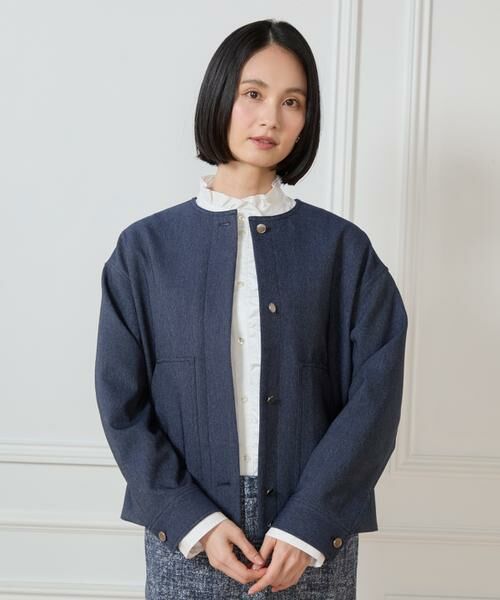 ソフトな着心地のデニム調素材を使用したノーカラーブルゾン。大人が着るGジャンを意識し素材選びとディテールに拘りました。アウトポケットやタックを施したバックデザインでカジュアルな表情を付けました。フロントの釦アクセントもポイントです。シワになりにくいイージーケア性がいつもきれいに着用できる嬉しいポイントになっています。・水洗い可同素材のクロップトパンツ品番:7051161808同素材のワイドパンツ品番:7051161809■サンプル撮影商品■こちらの商品はサンプルでの撮影となっております。実際の商品とは、サイズや色味、素材、デザイン等の仕様が若干変更になる場合がございます。