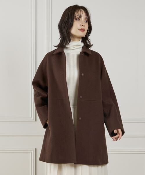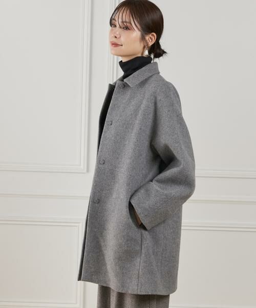 ボリュームを持たせた肩から袖のデザイン、ややゆったり目のコクーンシルエットが女性らしい一着です。丸みのあるシルエットながらも、着丈をやや短めにし、バランス良く着用できるようにしています。