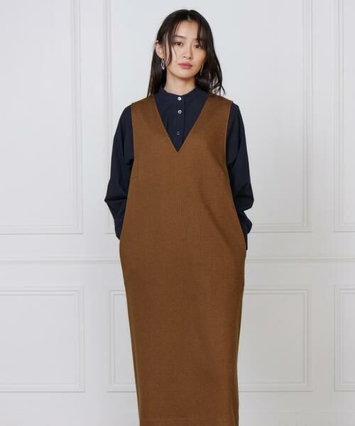 スッキリとした印象を与えてくれる深めのVネックがポイントのジャンパースカート。身体のラインを拾わないゆとりのあるサイズ感と広めのアームホールで様々なインナーとのレイヤードがお楽しみいただけます。後ろファスナーの引手にテープをあしらいアクセントを付けました。両脇に施したスラッシュポケットやトレッチ性のあるキレイ目な圧縮ジャージーの素材使いできちんと感がありながらストレスフリーな着心地を叶えました。