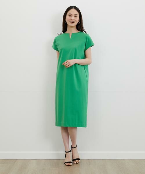 キーネックがアクセントになったコクーンシルエットのワンピース。程良いフレンチスリーブと全体のシルエットのバランスにこだわりました。両脇にシームポケットがあり、後裾はベンツ明きになっています。薄手で適度なハリ感が特徴の高級感のあるポンチ素材を使用しており、肌触りがよく、カジュアル過ぎず、綺麗めスタイルでも着こなせます。