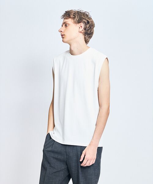 細すぎず、オーバーサイズすぎず、程よいサイジングのノースリーブTシャツ。