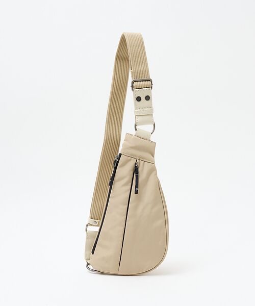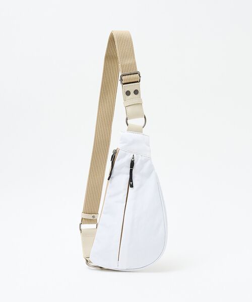 継続的にリリースされるアシンメトリーなフォルムは、デザインもさることながら体の線に沿ったフィット感と使い勝手が良く人気モデルに。両手フリーでアクティブに動くことができるから、さまざまなシーンで活躍してくれます。アシンメトリーなデザインでは、通常右肩にかける場合と左肩に掛ける場合で上下や左右に差が出てしまいますが、こちらの商品は表裏のデザインを均一にし、ショルダーベルトを外し付け替えることで見た目の差をなくし、デザインと機能性を両立させています。ナイロンなので、これから夏にかけての軽い時期にもオススメです。ボンディングで中に綿が入っているので、ふわっとしていてとてもかわいいです。また、カラーリングもニュアンスカラーを取り入れており、女性が使用しても◎要所要所で革を使用しているので、高級感もあり大人が持っても違和感のないナイロンボディバッグです。