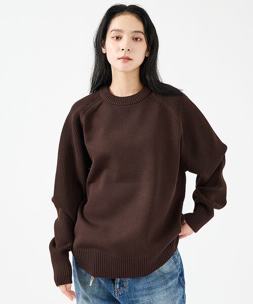 ・袖と身頃でゲージを変えることで違う素材をドッキングしたようなデザイン
