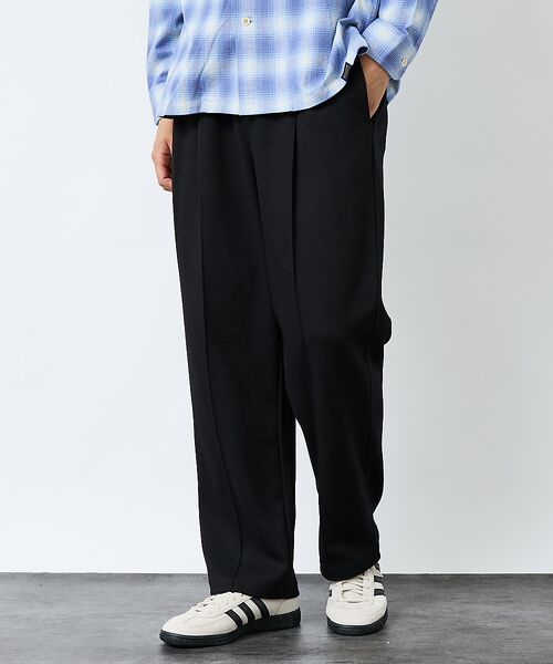 ・後ろ身ヒップまわりは程よくすっきりとさせたワイドストレートシルエットのスラックスをイメージし、そのパターンとサイジングに仕上げたイージーパンツ。前身には2本タックを入れ、ゆとりを出しています。