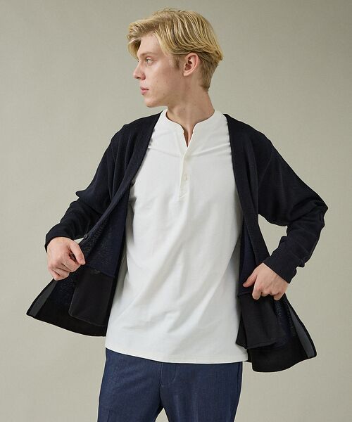 着流しカーディガンの雰囲気で着用できるため、Tシャツの上にサラリと羽織っても◎。
