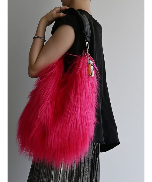 ボディはふわふわのモンスターファー、ショルダーストラップにはフェイクレザーを採用し、異素材のコントラストがコーディネートを一段と印象的に仕上げます。