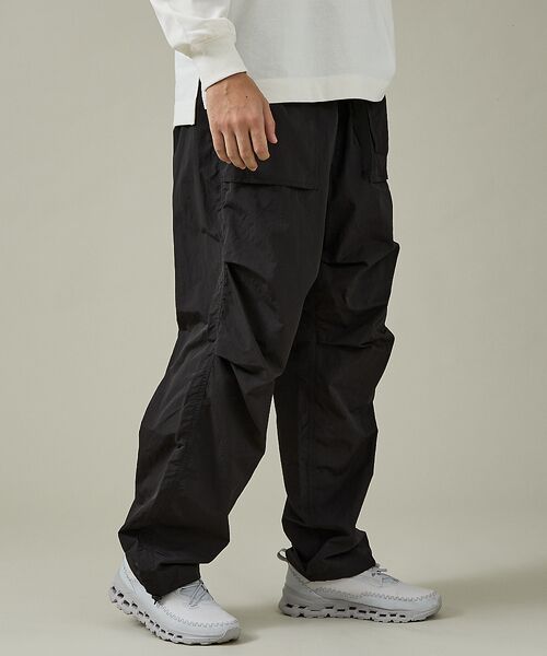 構築的なポケットデザインと立体感のあるシルエットが特徴の、ナイロンパンツ。