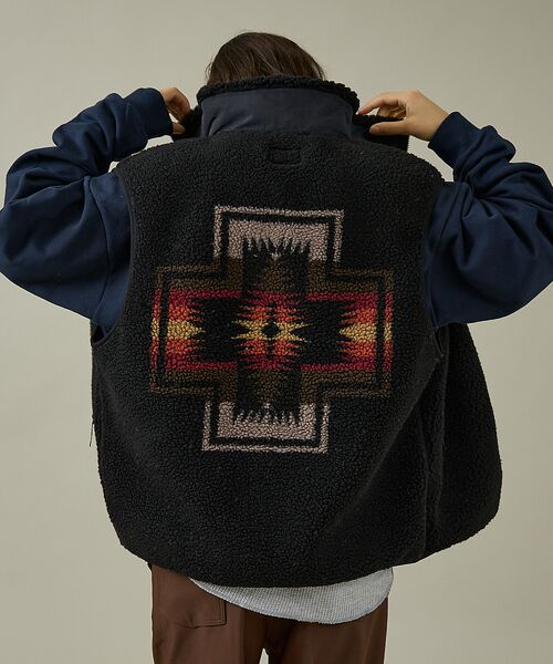 【PENDLETON / ペンドルトン】から、ブランドを象徴するネイティブ調ジャガード柄を採用した ボアスタンドベスト が登場。