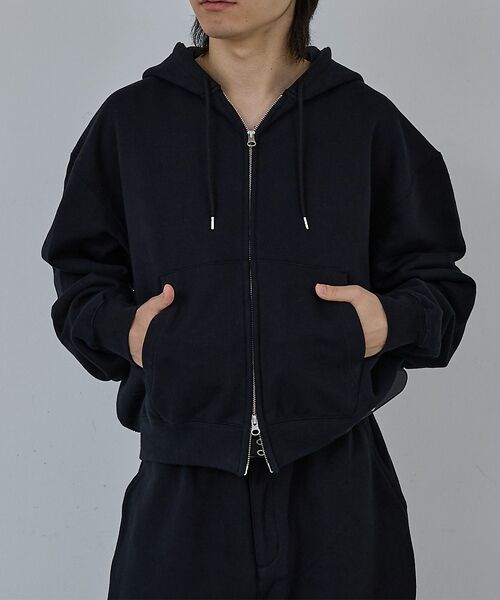 トレンドの“短丈×ダブルジップ”を採用した、モードな存在感を放つフーディー。