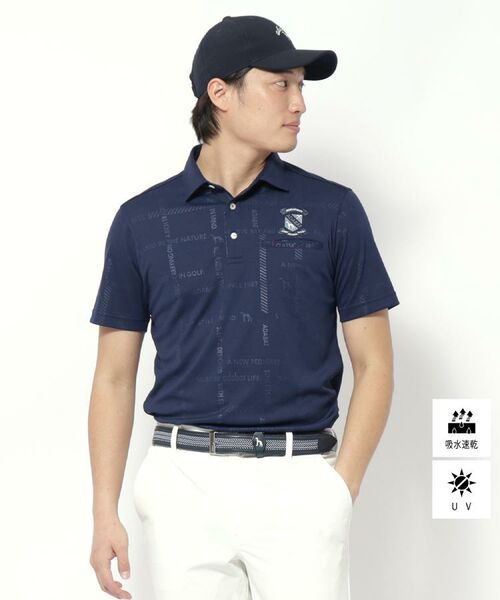 ロゴをエンボス加工で表現した総柄デザインが特徴的な半袖ポロシャツです。