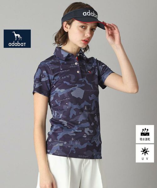 同系色で描かれたゴルフマップのグラフィックデザインがアクセントになる半袖ポロシャツ。